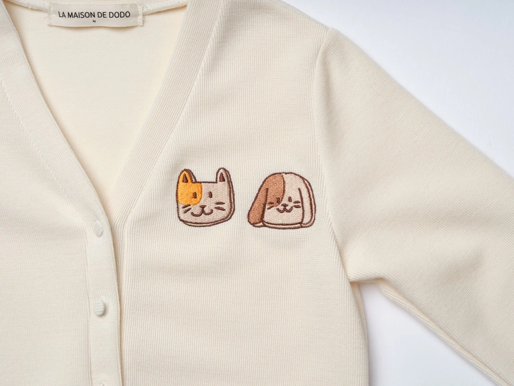 부드러운 원단으로 제작된 베이직한 필수 가디건으로서 이번 2023SS 시즌 “Cookie Land”의 개와 고양이 쿠키가 자수로 새겨진 제품입니다.